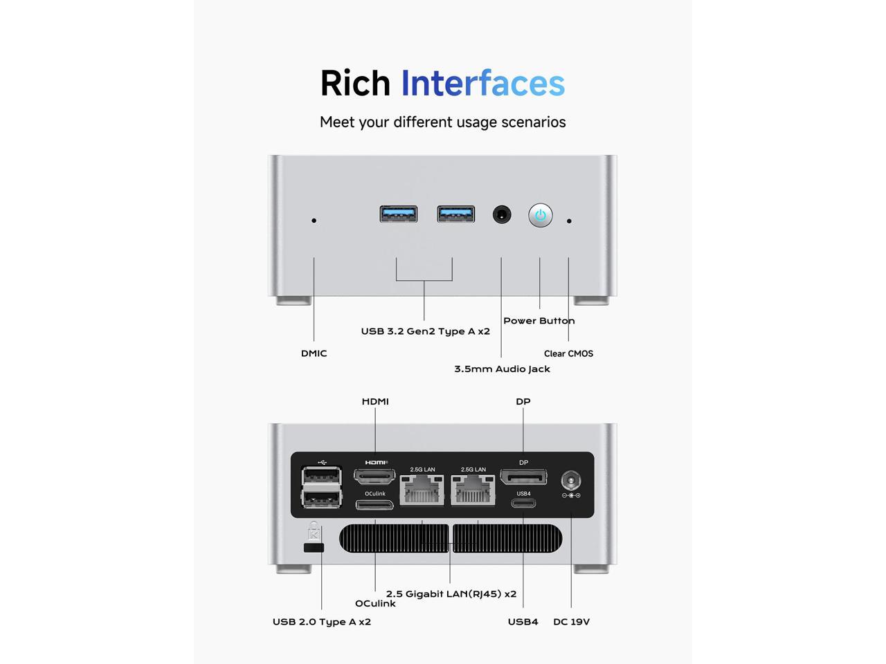 - OCulink Support: This mini pc was equipped with a OCulink port. OCuLink is a standard for externally connecting PCI Express, the speed is PCIe4.0 x4=64G. With this port, you could install external GPU with faster support speeds compared to Thunderbolt 4 and USB4. Note: *Non-hot-swappable, OCulink requires one M.2 2280 PCIe4.0 SSslot*.