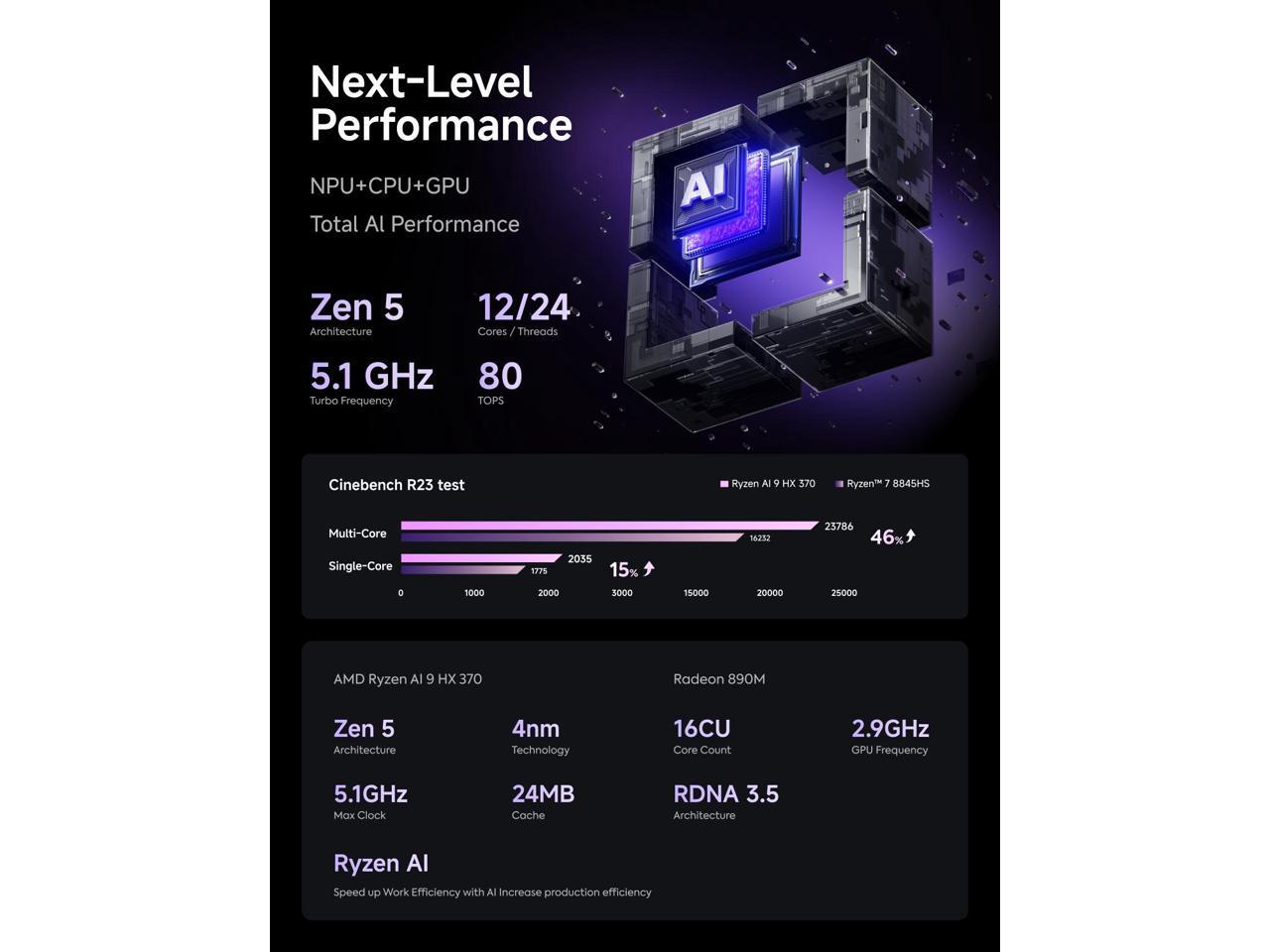 - Leading AI Mini PC: This Mini PC comes with AMD Ryzen AI 9 HX 370 processor, which uses AMD's latest generation Zen 5 architecture. It has 12 Cores and 24 Threads, the boost clock is up to 5.1GHz.