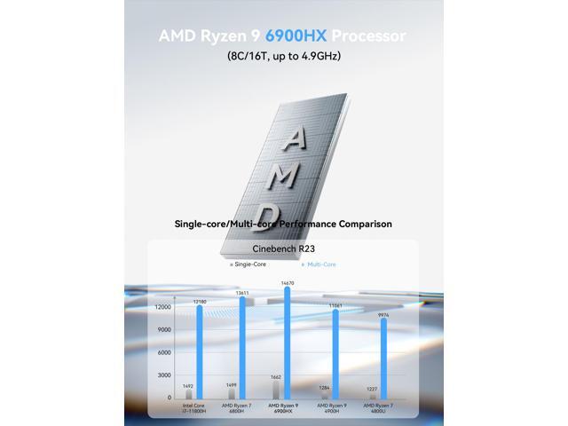 - Ryzen 9 6900HX Processor: The UM690L Slim Mini PC comes with AMD Ryzen 9 6900HX (6C/12T up to 4.9Ghz) processor. The faster performance can handle heavy computing tasks smoothly and better for multitasking. It widely used for light games, image editing etc.