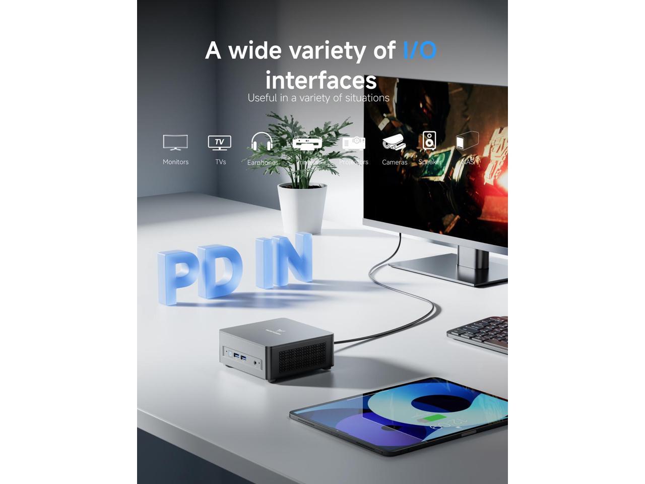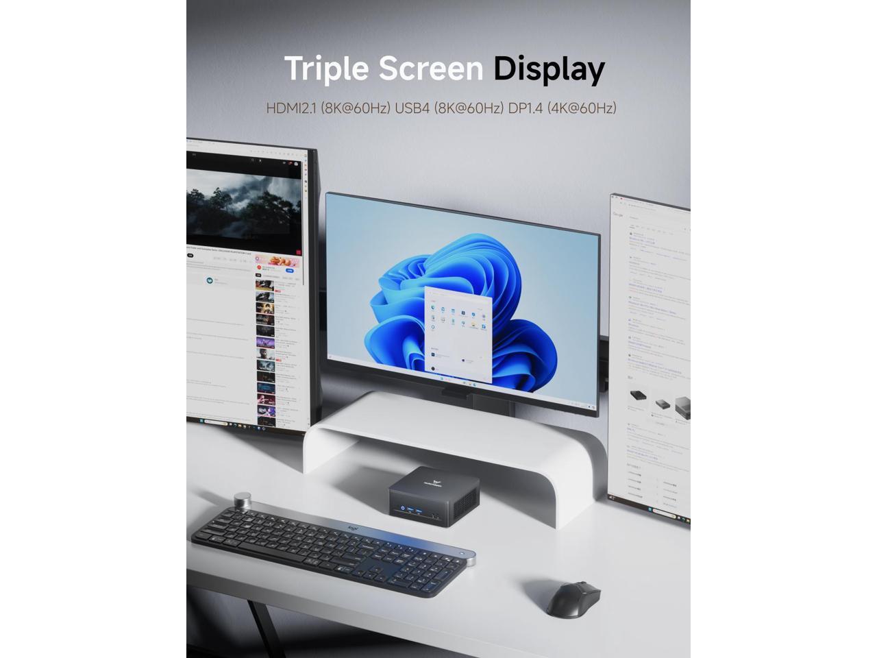 - 8K Display Output: This Mini PC equipped with three video output, 8K@60Hz display output via HDMI 2.1 and USB4 Port, 4K@60Hz display via DisplayPort, you could connect three independent displays, which ensures smooth navigation, responsive work processes and comfortable handling of apps and files .