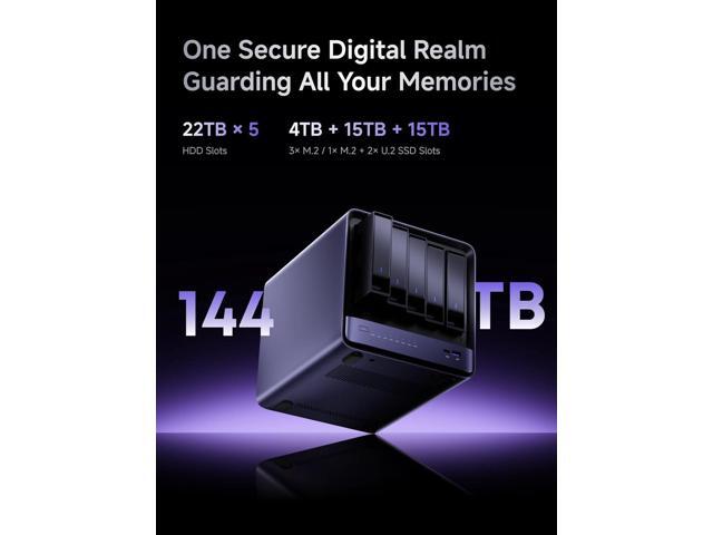 - The Ultimate DIY NAS Solution: It supports a huge 144TB storage. It has five HDD slots (up to 22TB each), three M.2 slots, and one M.2 plus two U.2 ports (up to 4TB + 15TB + 15TB). Enjoy seamless multitasking, storing data, movies, and photos freely. *Note: At least one SSD or 3.5-inch HDD is required to create a NAS storage pool and start using.