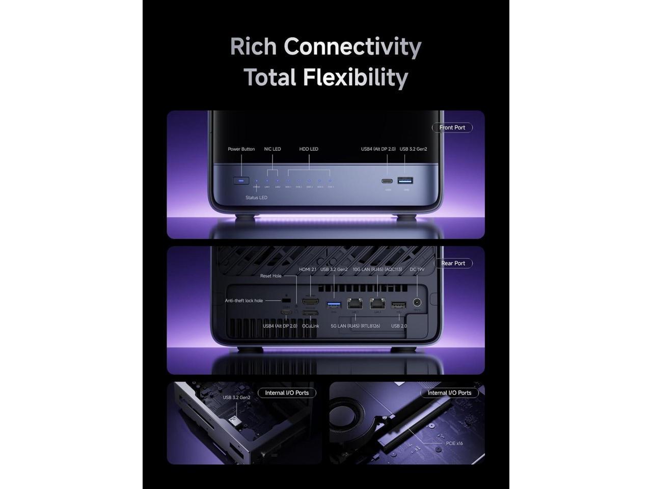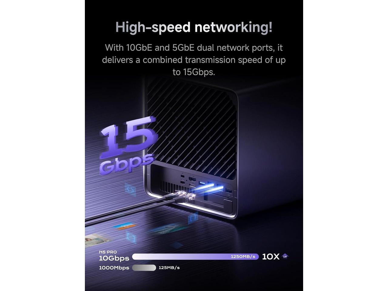 - Super Speed Connectivity: Dual 10GbE+5GbE ports support link aggregation, reaching up to 15Gbps. Transfer a 1GB file in under a second. One PCIe 4.0 slot enables network acceleration, SSD caching, and GPU expansion. OCuLink supports an external GPU, tripling Stable Diffusion speeds.