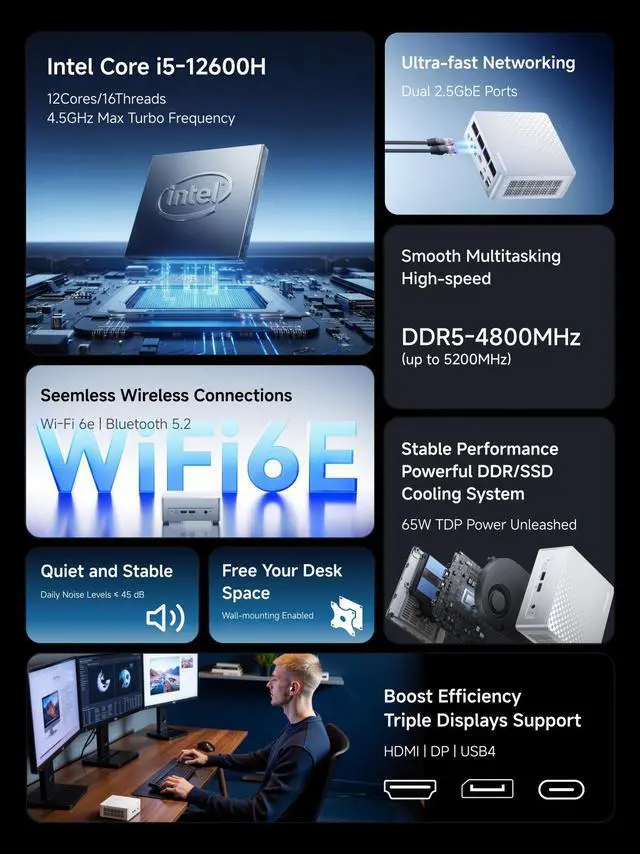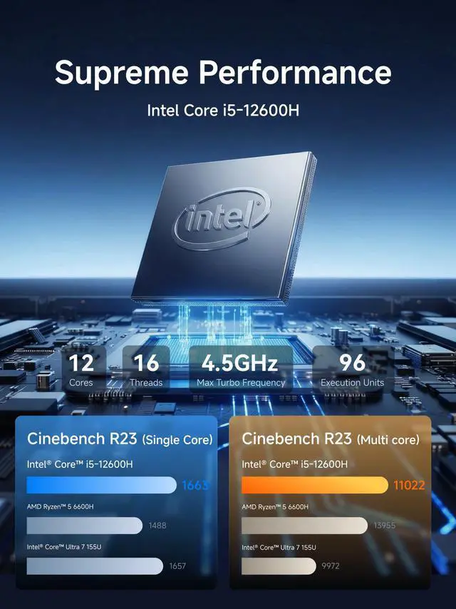 Great Performance: The MINISFORUM M1 Plus Mini PC is equipped with Core i5-12600H(12 cores/16 threads/up to 4.5GHz) Processor.