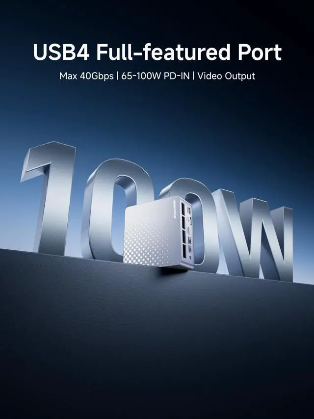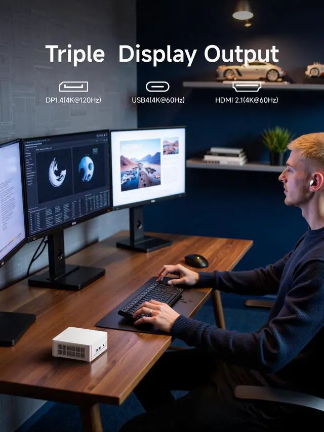 Triple Video Output Capability: Expand your visual horizons with the M1 Plus Mini PC, which boasts 1x HDMI2.1 (4K@60Hz), 1x DP1.4 (4K@120Hz) and 1x USB4 outputs. Connect up to three HD screens simultaneously to optimize your workspace and maximize productivity.