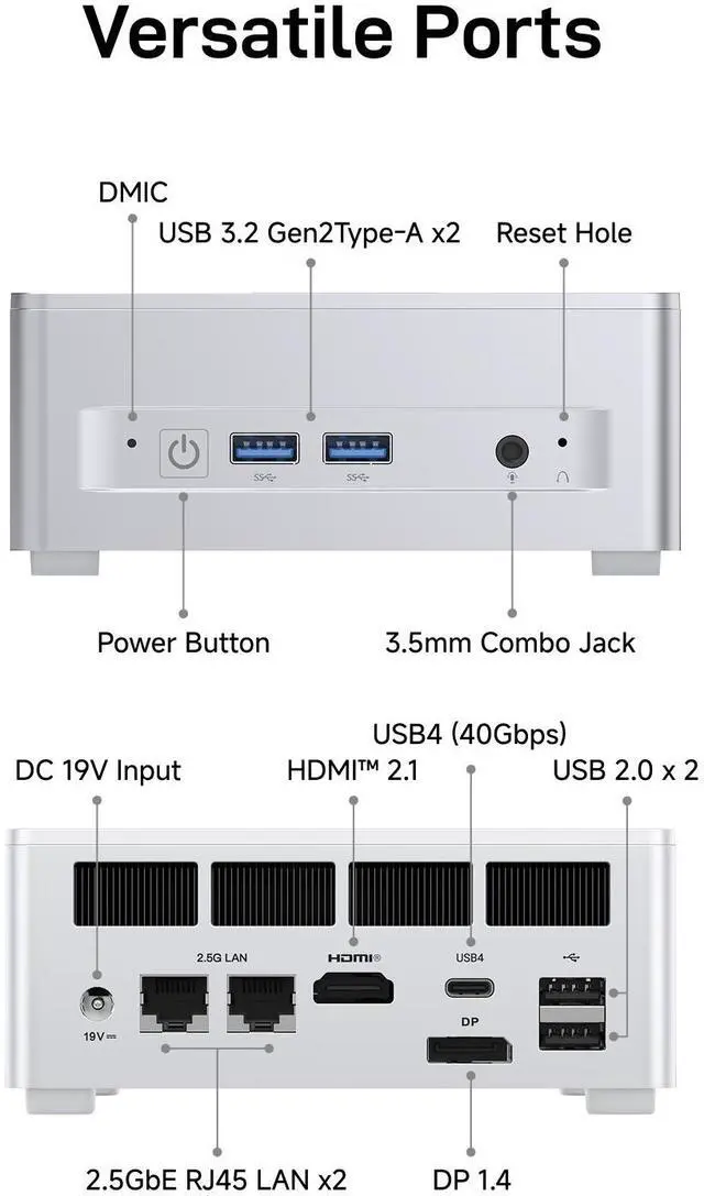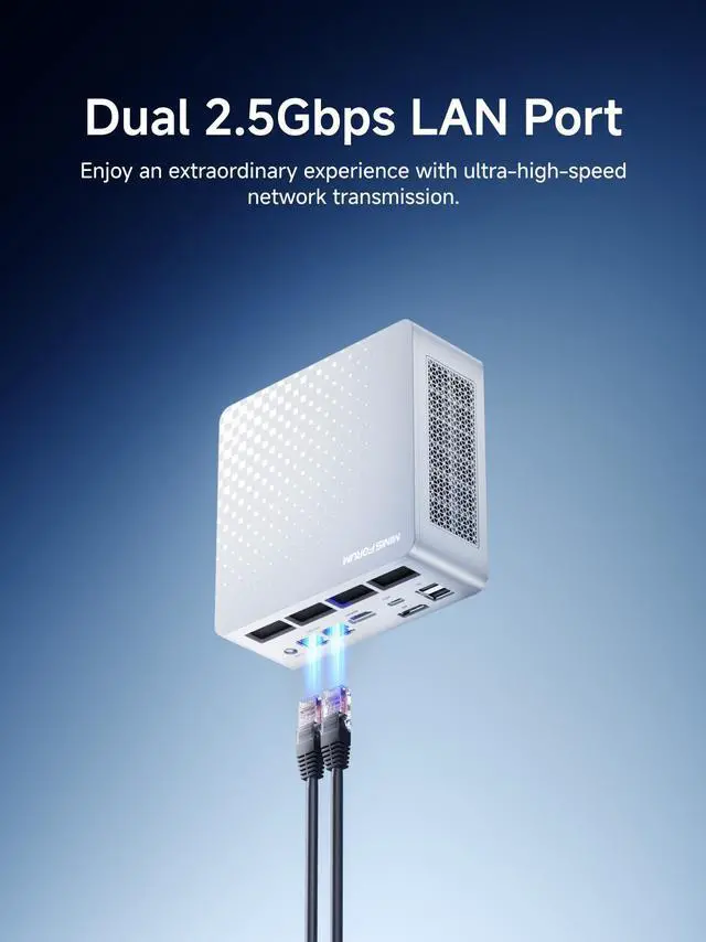 Comprehensive I/O Options: The M1 Plus Mini PC offers a wide range of connectivity options, including 1x HDMI2.1 Port, 1x DP1.4 Port, 1x USB4 Port, 2x USB3.2 port, 2x USB2.0 port, 2x 2.5G LAN ports, 1x 3.5mm audio jack, 2x DDR5 SODIMM slots.