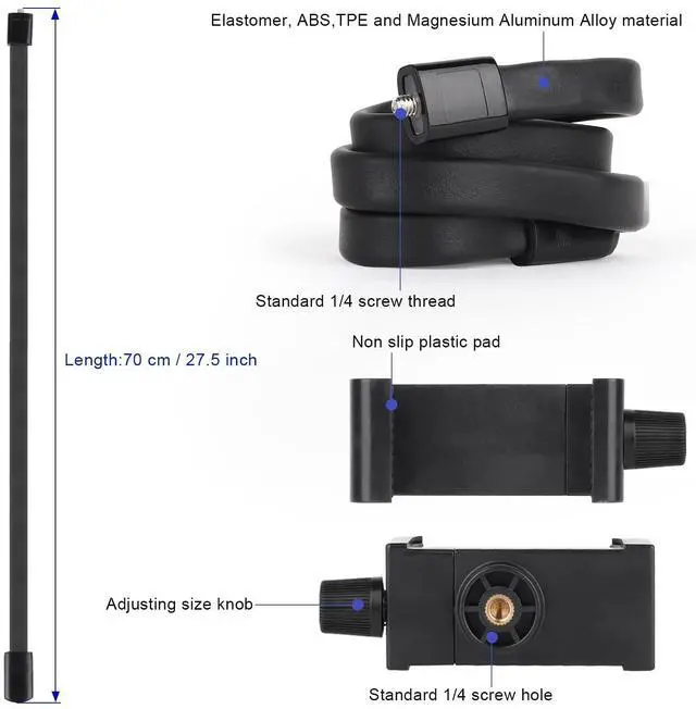 Our flexible twist phone stand is 70cm/27.5 inch length, Elastomer,ABS,TPE and Magnesium Aluminum Alloy material,it has abilities to hold your cellphone firmly and securely,doesn’t fall off when shaking and swaying.