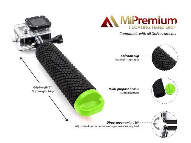 Our floating handler comes with standard built-in mount, allowing you to mount go pro or other action cameras without the need for additional mounting attachment accessories. Though your camera or camera case should have 2 fork mounting attachment.