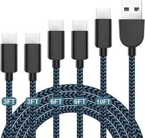 5Pack (3/3/6/6/10FT) Fast Charging 3A USB-C to USB-A Cable Rapid Charger Quick Cord Compatible Galaxy S10 S9 S8 Plus Note 10 9 8 LG V50 V40 G8 G7(Blue)