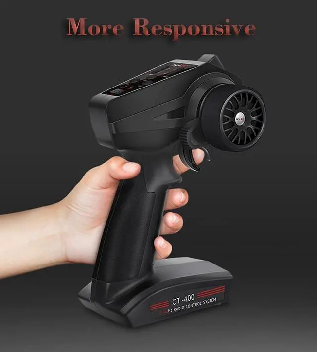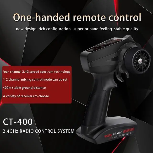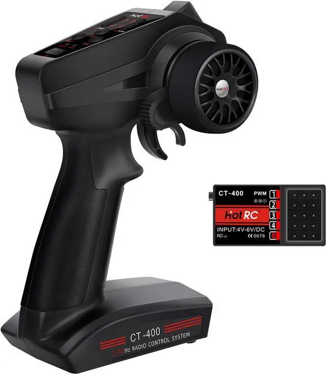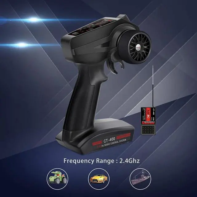 2.4G hz Stable Signal 2.4GH z 4CH remote controller with CT-400 receiver are perfect used for RC Car Boat Tank models. 2.4GH z Frequency and 3ms Receiver responses. Stable control your model 400-500M, make good works and protect when it out of control.