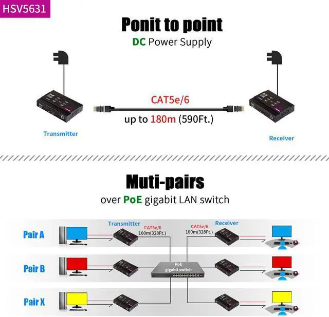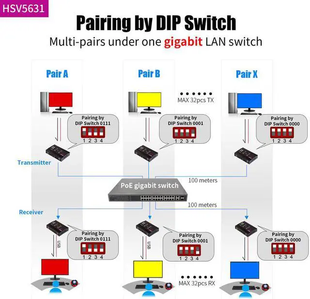 HSV5631 uses Gigabit IP network technology to process and distribute 4K ultra-high-definition video signals. At the same time, the mouse and keyboard control signals are sent from the receiving end to the transmitting end to realize the KVM extension function. Through DIP switch dial code pairing, multiple pairs of HSV5631 can be operated in the same switch without affecting the normal operation of other devices.Especially suitable for Internet cafes, server rooms, CCTV,Home etc.