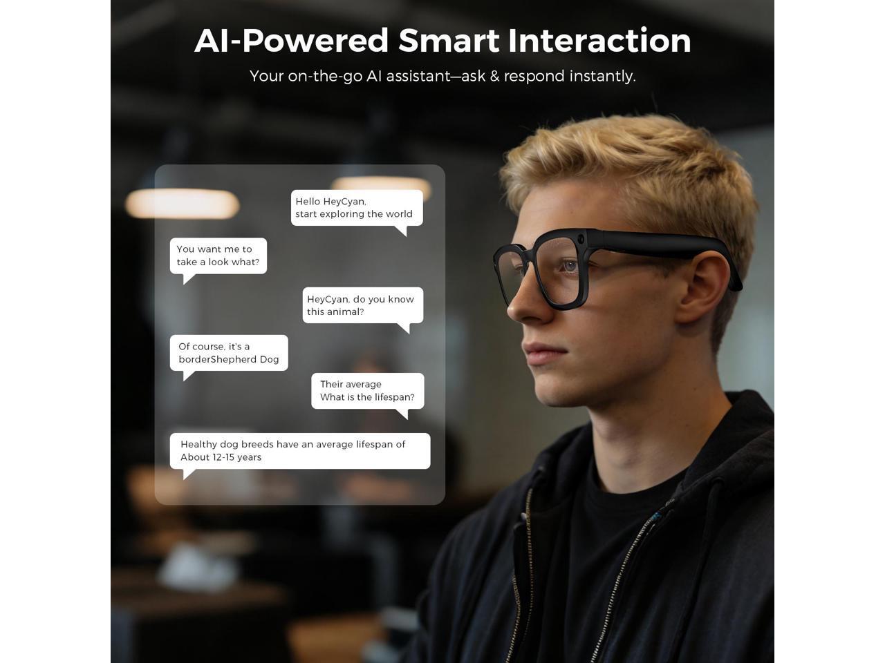 - Seamless Bilingual AI Assistant: Powered by ChatGPT for global users, these glasses offer real-time translation and intelligent conversation. A simple voice command like "Hello, Cyan" wakes it up, letting you access information and communicate hands-free, anywhere.