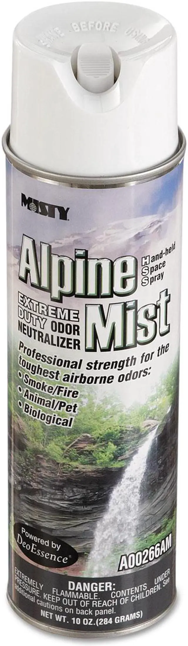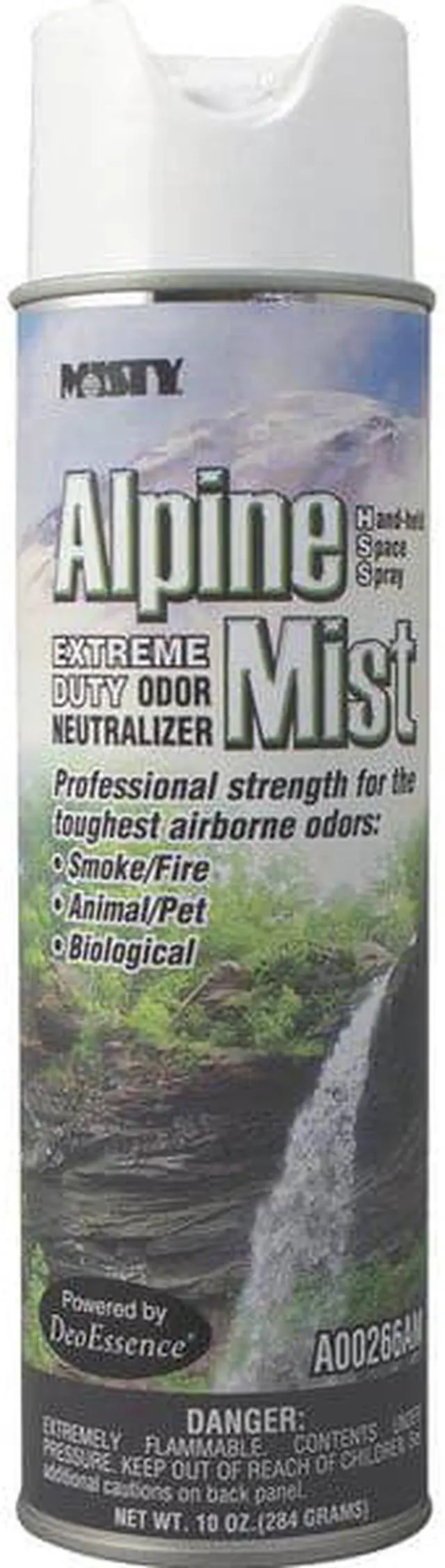 Professional strength for the toughest odorssmoke/fire, animal/pet and biological odors. Super dry air deodorizer formula contains ultra fine particles for maximum diffusion. Powered by DeoEssence integrated fragrance/odor counteractant system. Compliant in all states. Non-chlorinated and non-ozone depleting. Ideal for use in most settings beyond the restroom such as hospitals, schools, offices, gyms and restaurants. Scent: Alpine Mist; Physical Form: Liquid; Application: Odor Control; Volume Capacity: 10 oz.