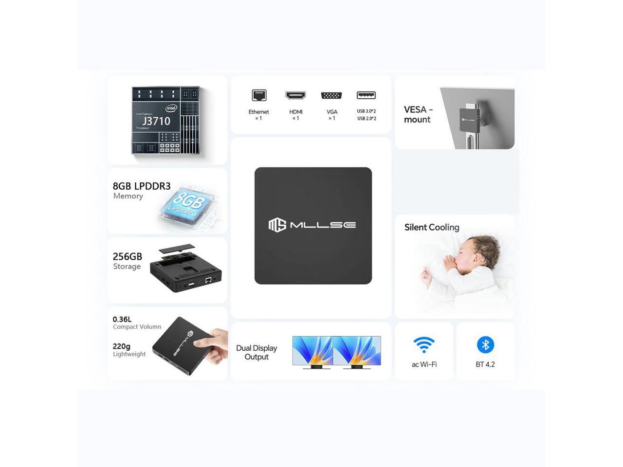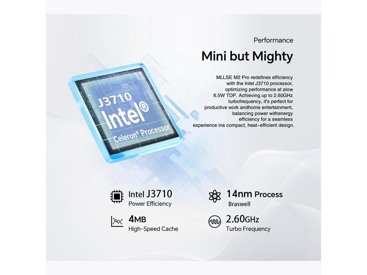 - The MLLSE M2 Pro, powered by the Intel J3710 processor with up to 2.60GHz turbo frequency and 6.5W TDP, offers optimal performance for both work and entertainment, combining power and energy efficiency in a compact, heat-efficient design.