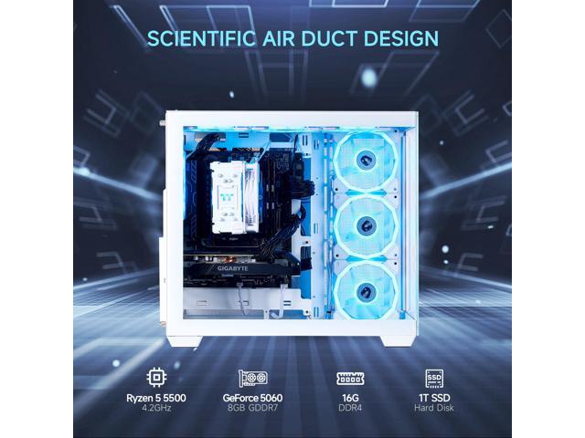 MLOONG Gaming PC, AMD Ryzen 5 5500 4.2 GHz, GeForce RTX 5060 8GB Desktop Computer, 1TB NVMe SSD, 16GB DDR4 3200MHz, Air Cooled Prebuilt, 650W PSU, Windows 11 Home & AI powered Gamer PC. White