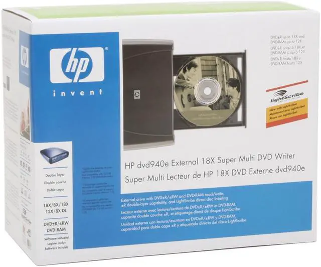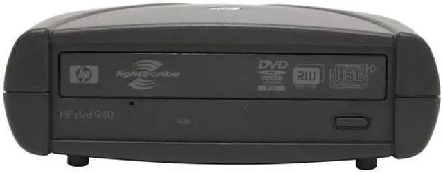 HP Black 18X DVD+R 8X DVD+RW 8X DVD+R DL 18X DVD-R 6X DVD-RW 12X DVD-RAM 16X DVD-ROM 48X CD-R 32X CD-RW 48X CD-ROM USB 2.0 External DVD Drive with LightScribe Model HP 940 E