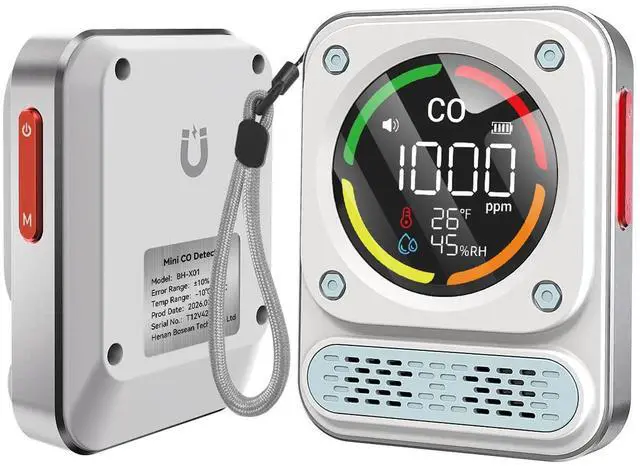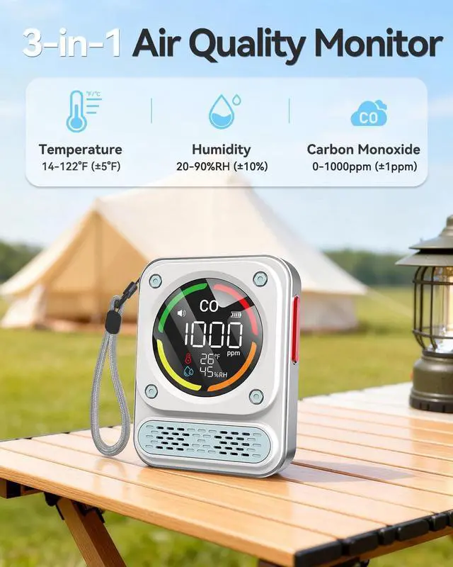 MOESAPU 3-In-1 Portable Carbon Monoxide Detector, 0-1000ppm CO Meter with Temperature Humidity, 260H Standby Rechargeable Battery, Magnetic Air Quality Monitor Alarm for Travel car Camping Home Safety