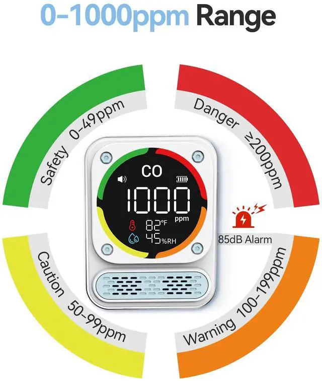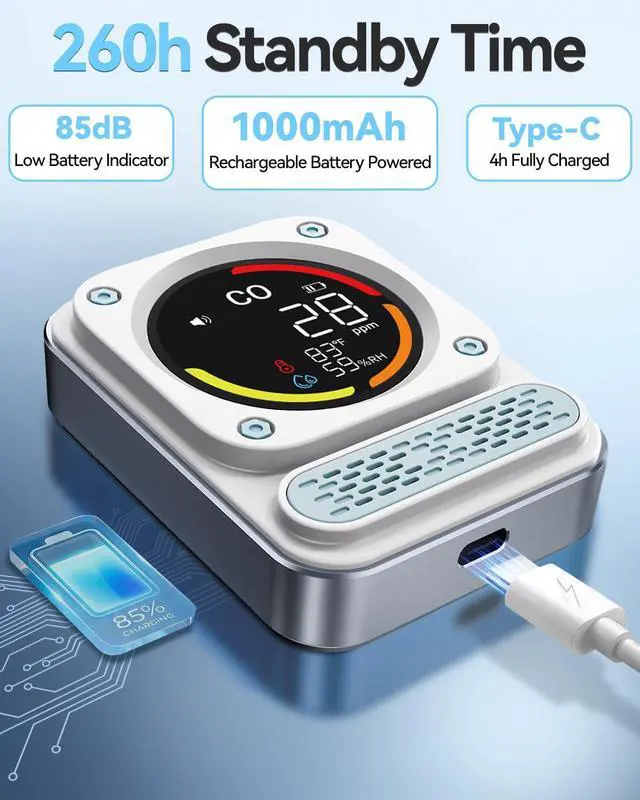 Large Capacity Battery to Last 11 Days: Powered by rechargeable 1000mAh battery, CO detector offers exceptional 260 hours of standby time, which automatically enters low-power mode after 1min of inactivity yet never stops working. Full charge takes only 4 hours via Type-C port, and proactive low-battery indicator gives you ample warning to recharge timely, making it utterly reliable for vacations and power outages