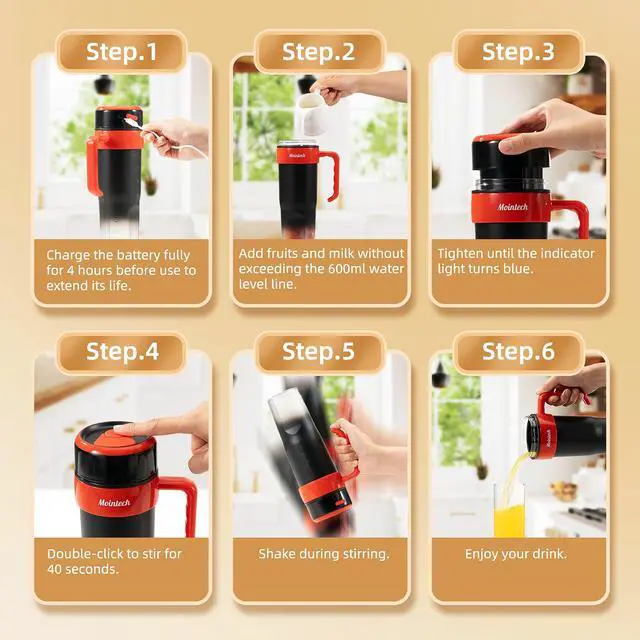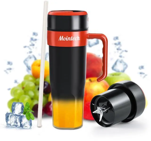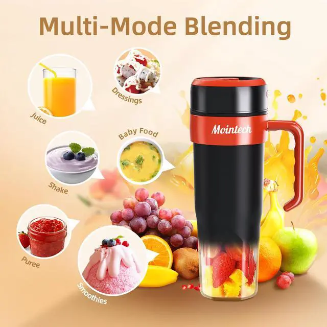 Easy to operation & cleanThis Mointech juicer feature 6 ultra-sharp 304 stainless steel blades and a 18000 rpm rotational speed. Double click the button to start blending, and it provides enough blending power to meet your daily needs in just 40 seconds. Which allows easy disassembly into two parts: lid and blend cup. Plus, We've got you covered with cleaning tools, including a straw brush, cup brush, ensuring a thorough and effortless clean up