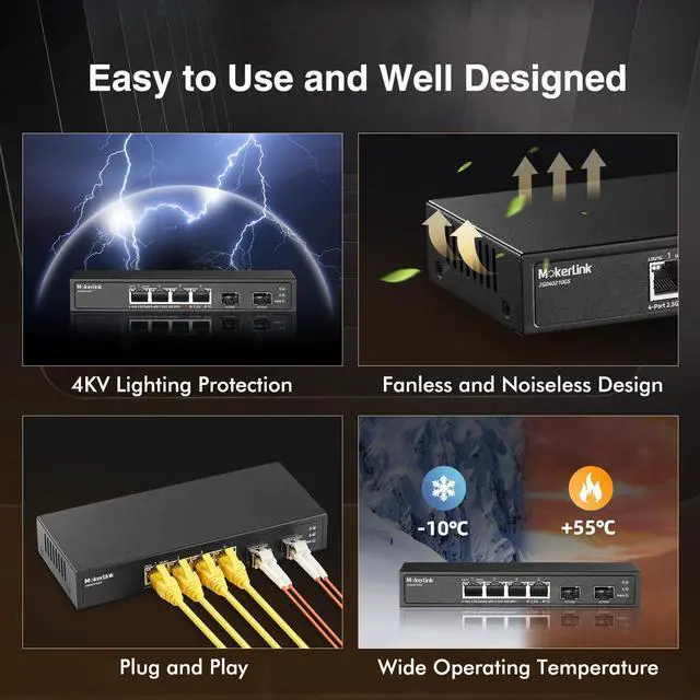 The 4 port 2.5g switch fetures with 6KV power port surge protection and 4KV network port surge protection can adapt to harsh environment.