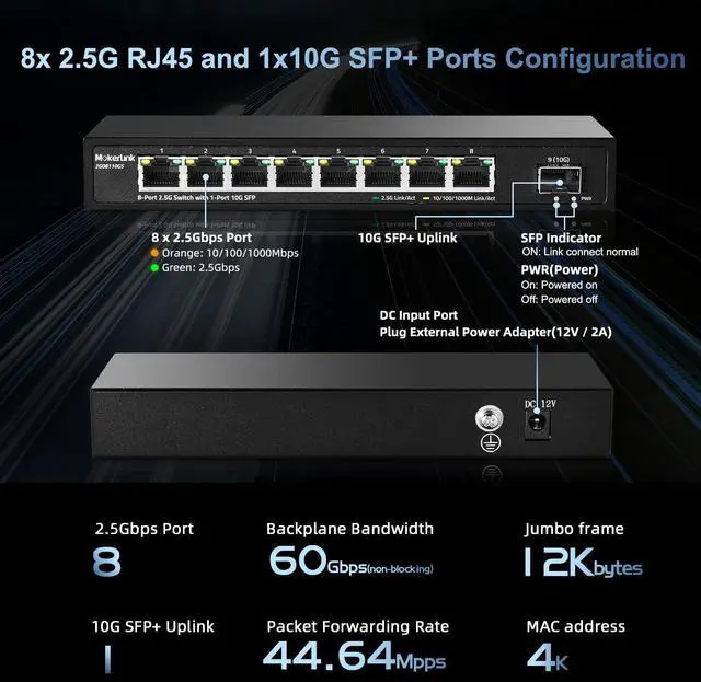 | Ethernet | 8*2.5G RJ45 ports + 1*10G SFP ports |
