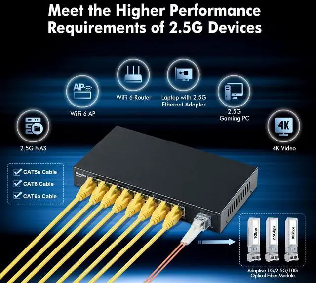 Upgrade to 2.5Gbps speed without changing cabling, you can use Cat 5e and above cables.