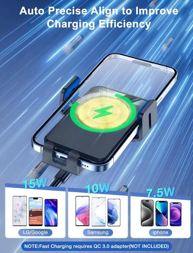 Our wireless fast charging car phone mount with high-speed wireless charging technology and provides safe and fast charging. It can work with all support wireless chargering phones and fits most car air vents.
