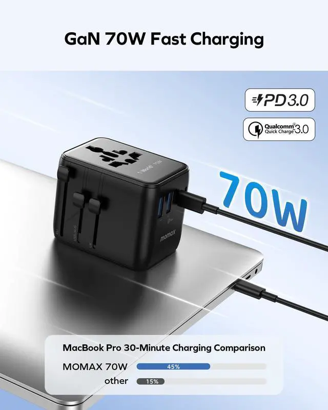 - PD 70W Fast Charging, Advanced GaN Technology - With 3 USB-C ports, 2 USB-A ports and 2 AC outlets (up to 2500W), this universal travel adapter supports PD 3.0 and QC 3.0 fast charging. One of the USB-C PD ports is capable of ultra-high speeds of up to 70 W. MOMAX's advanced Gallium Nitride technology compresses this conversion adapter into a surprisingly compact size and light weight with additional ports, faster charging speeds, and cooler temperatures