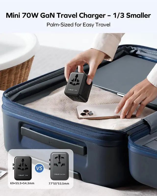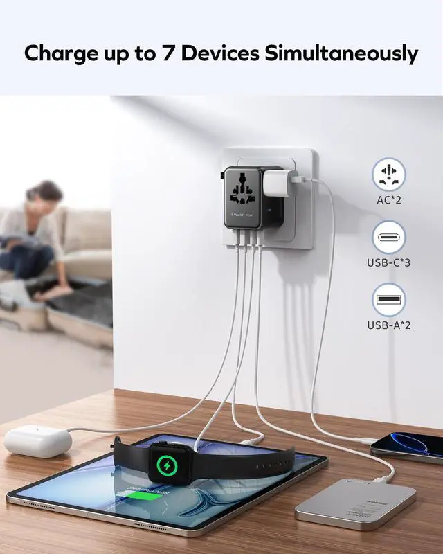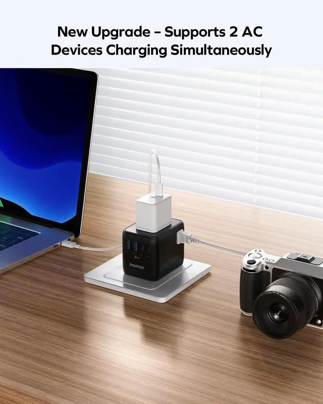 New Model, Dual AC Ports: The latest version of the MOMAX Travel Converter Plug is more compact and portable than the previous model under the same 70 W fast charging conditions. In addition, a new AC plug has been added, allowing two chargers to be used at the same time. With a total of 7 ports, 7 devices can be charged at the same time. The AC socket on the front has also been improved, eliminating problems with poor contact and difficult plugging and unplugging