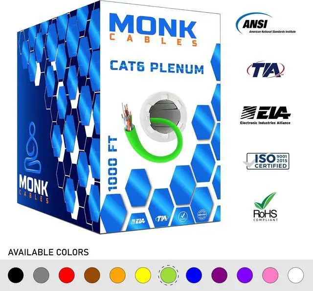 • REMARKABLE PERFORMANCE & DURABILITY : Our RoHS compliant (CCA) CAT6 Plenum 1000ft cable is 23AWG with 4 pairs (8 conductors) | It produces a stronger signal, along with improved conductivity, compared to any other cable in the whole market | Suitable for 10 gigabit ethernet | Supports PoE & PoE+ up to 60W