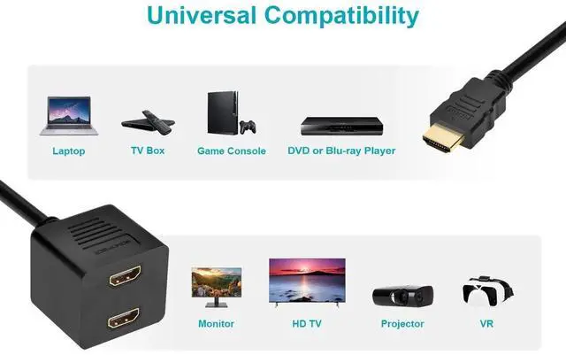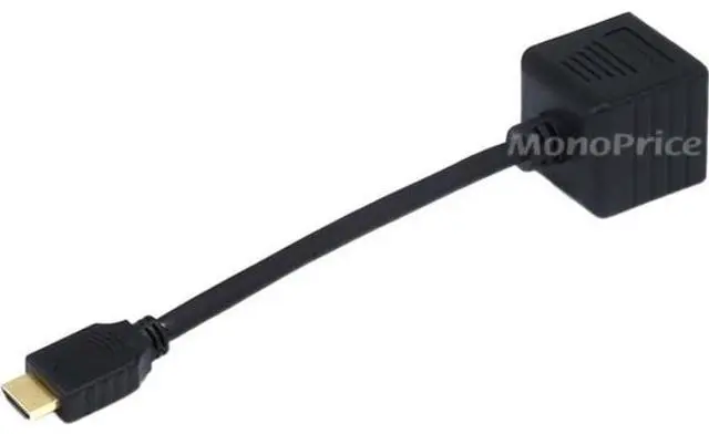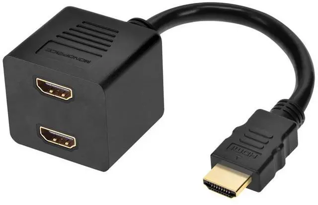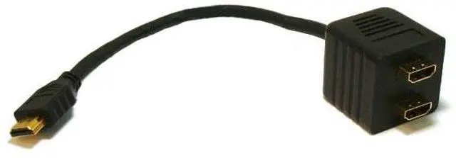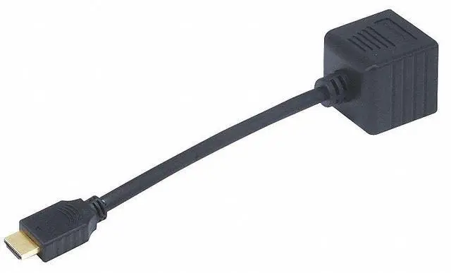 This passive splitter will distribute a single HDMI input to two HDMI outputs. The single HDMI plug and two HDMI ports are gold plated to ensure smooth, corrosion-free connections. Note that this splitter does not pass the HDCP copy protection information, so it is unsuited for use in home theater systems. Please use one of our powered splitters for home theater applications.