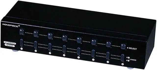 The Monoprice VX-8208F matrix switcher allows you to connect 2 VGA video source devices to up to 8 VGA video displays. Each output is independantly controlled meaning you can have two different images or sync two images together.