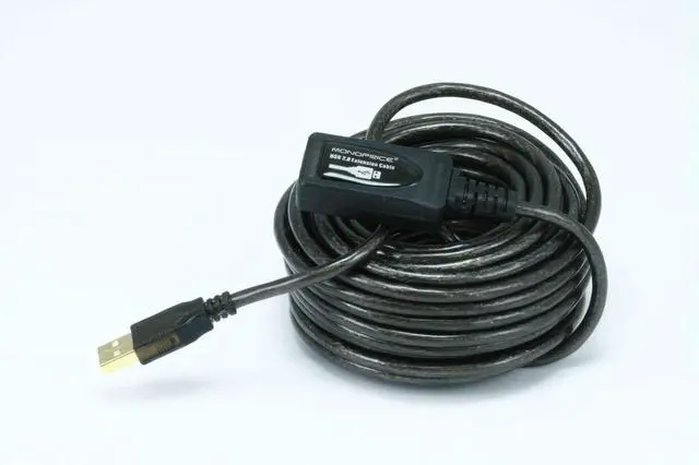 Due to its design, USB cable has a normal maximum length of about 5 meters ( 16.4 feet), but you can get longer distances by using an active USB extension cable from Monoprice! This is a bus-powered extension cable that can be used to increase the length of a device without any signal loss or potential performance problems. It contains active electronics, which boost the USB signal for maximum reliability and performance over extended distances. The cable operates as self-powered extender, for use with USB cameras printers webcams keyboard/mouse, etc. It is a true plug-and-play device.