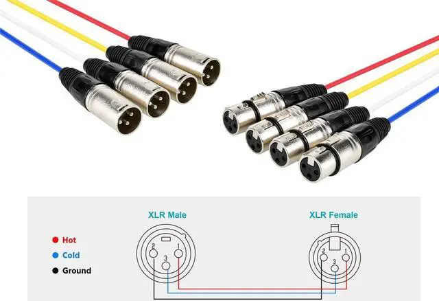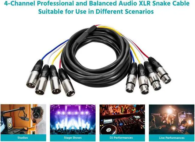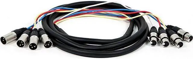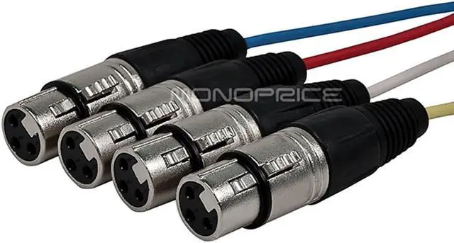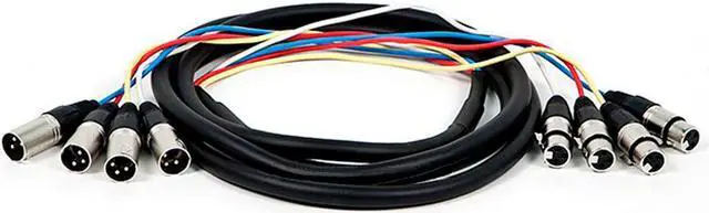 Get 4-channel, professional, balanced audio XLR cable snakes from Monoprice for less than you're used to paying for each XLR cable alone! These XLR cable snakes feature four sets of male-to-female XLR cables assembled into a single, soft and durable, cable jacket. Each XLR connector has a silver metal housing and is connected with a color coded wire, so you can quickly and easily make the right connections the first time, every time. The cables are colored red, blue, white, and yellow. The connector housings are metal with plastic and rubber cable boots to reduce strain on the physical connection.