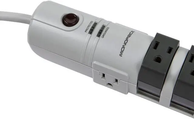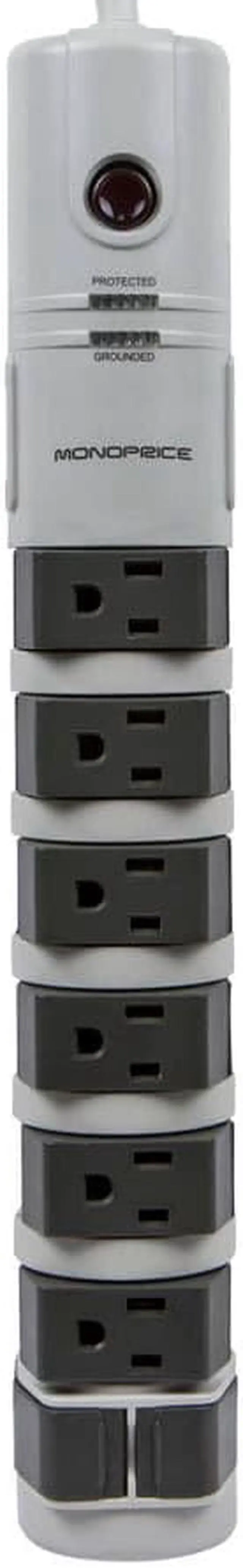 The Monoprice 8-Outlet Rotating Surge Protector features eight protected outlets, six of which can rotate 180? for use with bulky power adapters, without blocking adjacent outlets. It is rated for 125 VAC, 15 amps/1800 watts and provides up to 2160 Joules of power protection, with the ability to handle current spikes up to 144,000 amps. One LED indicates that the surge protector is plugged into an outlet with a valid ground connection, while a second LED indicates that surge protection is active. When the latter LED turns off, the protection circuitry has been consumed and the the protector should be replaced. An auto shutoff feature turns the protector off to when the protection has been consumed to prevent damage to your equipment. The switch doubles as a circuit breaker and it has a six foot power cord with a straight connector.