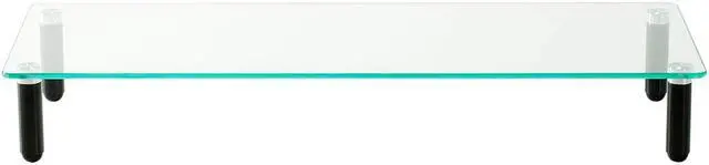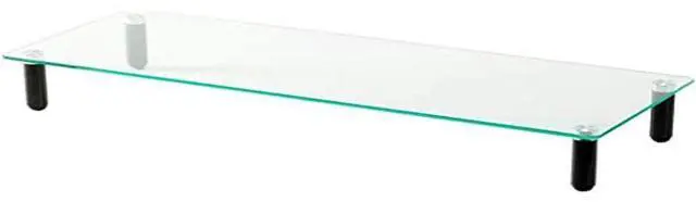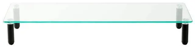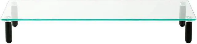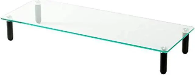 Give yourself an extra shelf or raise your monitor to a comfortable height with this stackable glass shelf for a computer monitor, laptop computer, home audio equipment, or anything else that needs a flat surface. This beautiful glass shelf measures 22" wide and 8.25" deep, and matches any decor with tasteful black feet.