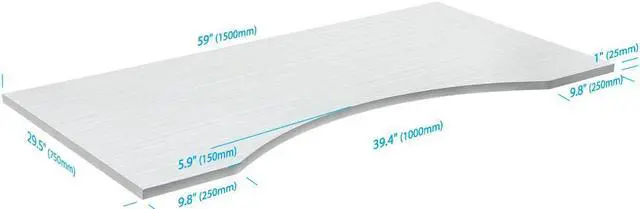 - 59.0 inches by 29.5 inches rectangular desktop with 1 inch thickness, with ergonomic front cutout