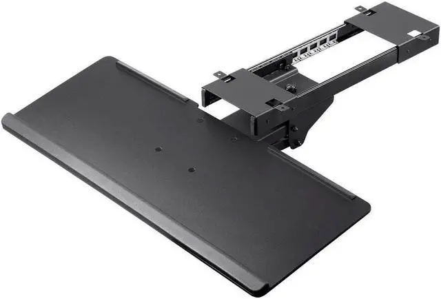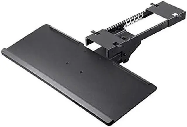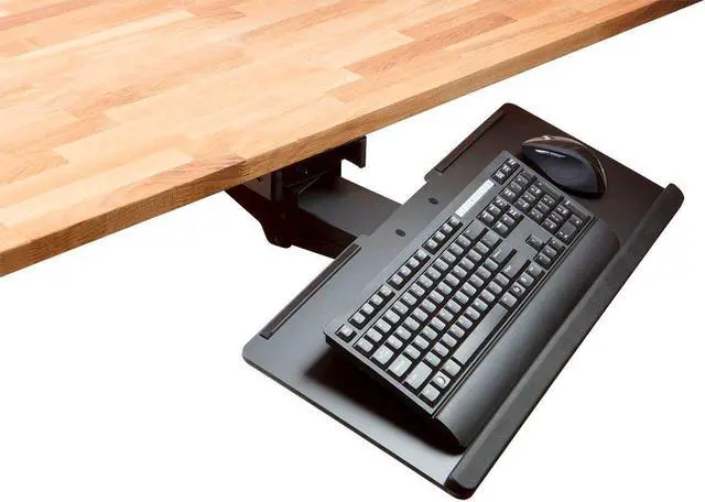 Adjustments are easy to make, just turn the adjustment knob to move and lock the keyboard tray in place. The full-sized work surface provides ample room for a standard mouse and keyboard and keeps them on the same plane for better comfort. Quality steel and composite wood materials ensure stability and durability to survive daily use. This keyboard tray works with most standard desks with at least 18 inches of flat under-table space.