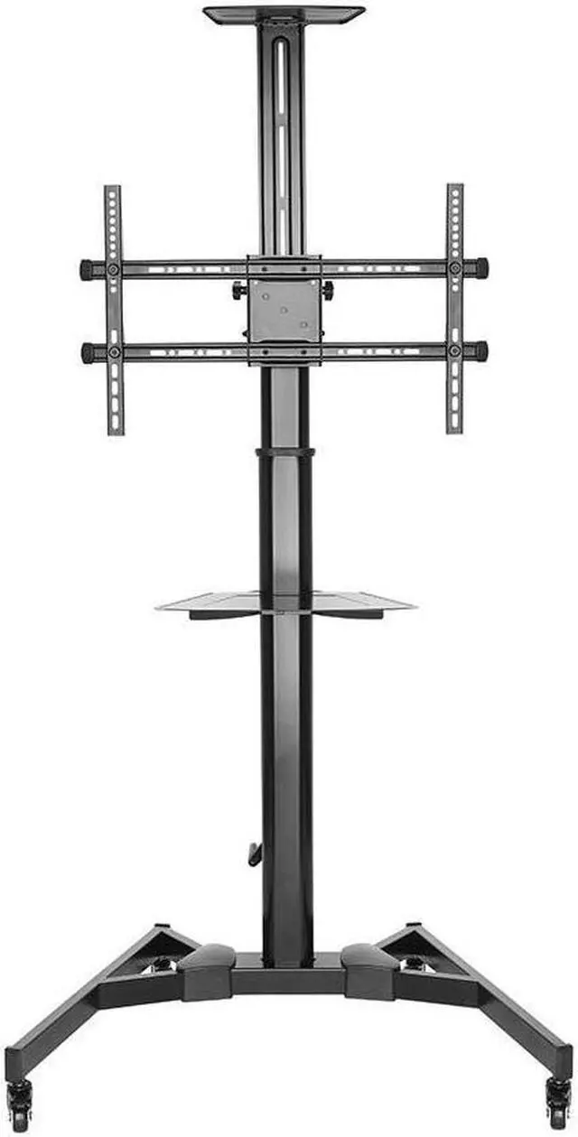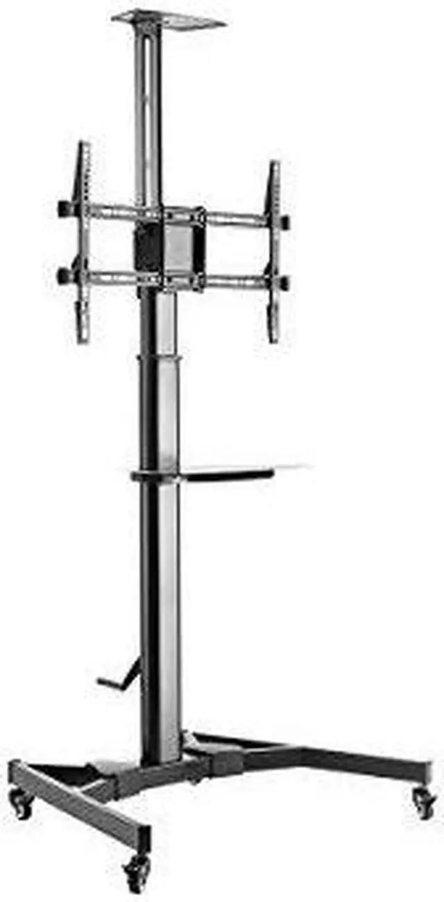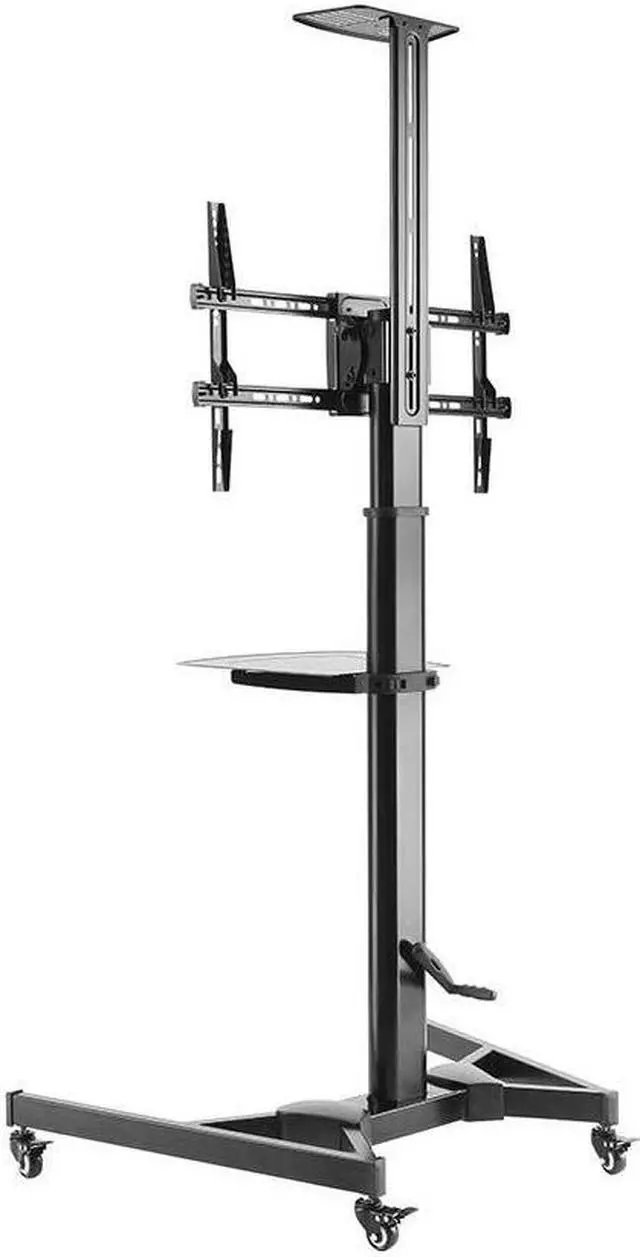 The Monoprice Commercial Series Premium Mobile TV Cart is the perfect way to move a 37" to 70" TV weighing up to 100 lbs., making it ideal for use in conference rooms, at trade shows, in schools, and any place where video presentations are used. It features a solid frame made of cold-rolled steel, a hand crank to raise or lower the display, and a TV mount bracket that can be tilted ±10 degrees and rotated 90 degrees for landscape or portrait display orientation. The large, heavy-duty casters can be locked to ensure the cart stays in place, even on uneven surfaces. The media shelves can be used for placing a DVD player, laptop, or other equipment weighing up to 11 lbs. for additional convenience.