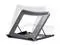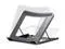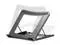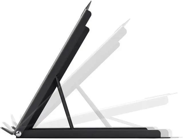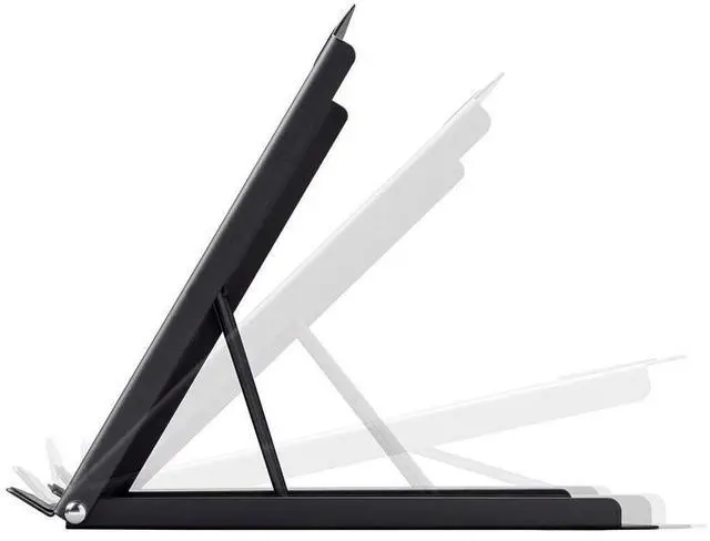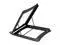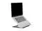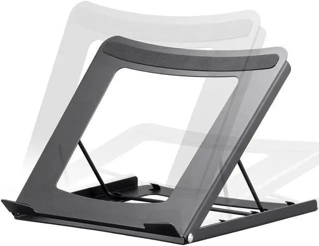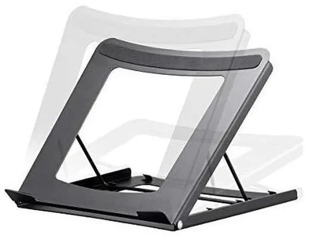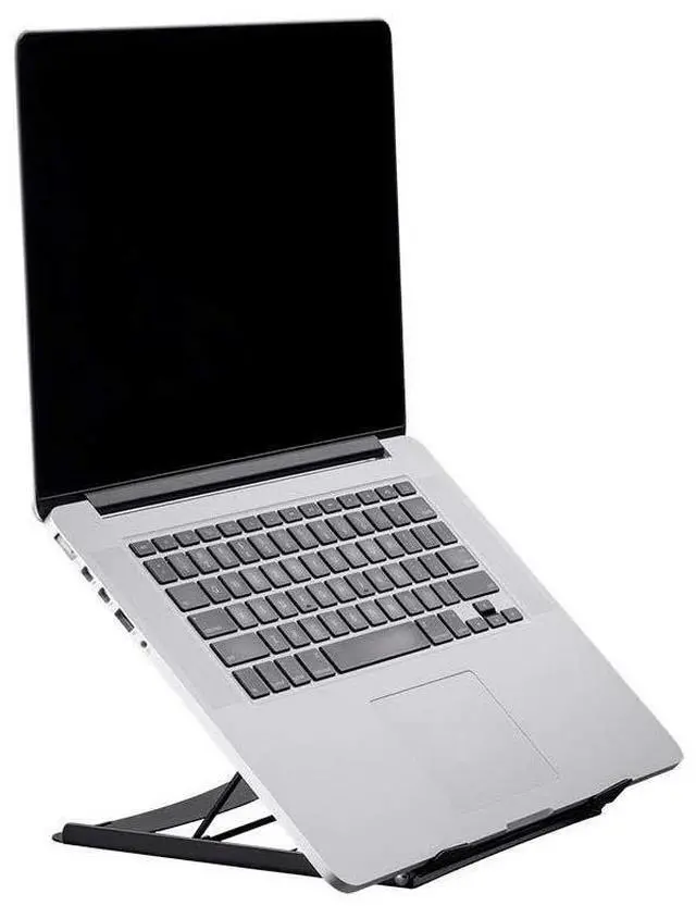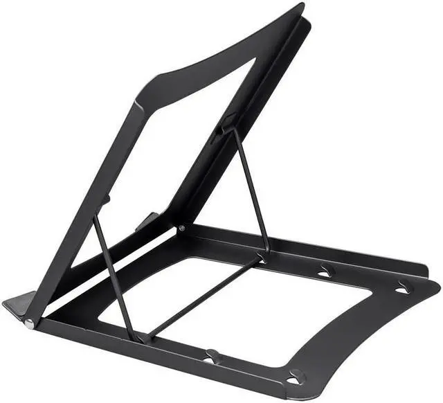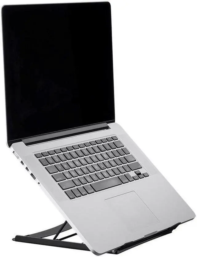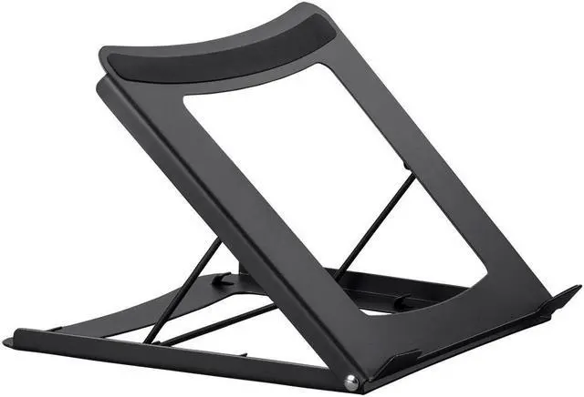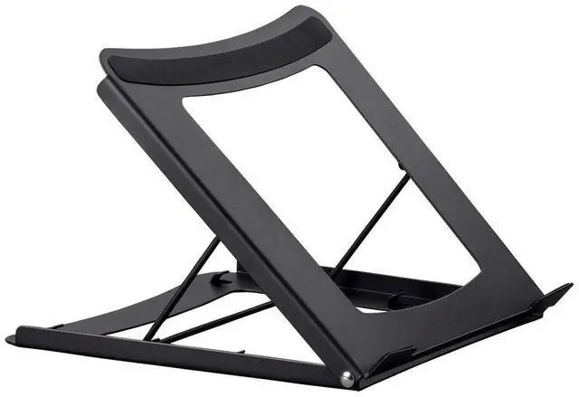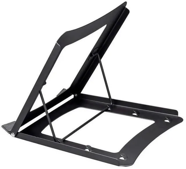 This metal laptop stand provides an easy way to elevate and angle laptops for better screen viewing and comfort. The stand can be used in 3 angle settings and folds flat when not in use, so it is easy to take along in a laptop bag. The open design ensures sufficient airflow to aid laptop cooling. It works with most laptops and is recommended for portable computers with up to 15" screens.