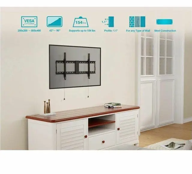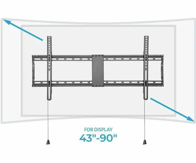 Specifically designed for large screen TVs, this SlimSelect Series LowProfile Wide Fixed TV Wall Mount Bracket features a lowprofile design with solid holding power. The lowprofile design mounts your TV a mere 1.1" from the wall, allowing it to more easily blend in with the surrounding decor. It is designed for curved or flat screen TVs from 43" ~ 90" weighing up to 154 pounds, with VESA mounting patterns from 200x200 to 800x400. The builtin antitheft system allows you to lock the TV to the mount, making it perfect for use in commercial applications, such as hotel and motel rooms.