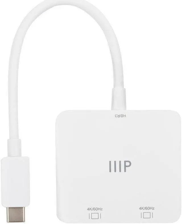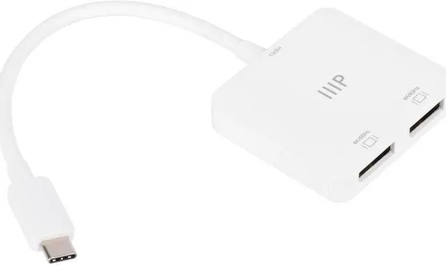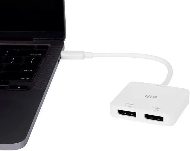Unclutter your computer desktop and make your work easier and more productive by adding up to two 4K@60Hz DisplayPort displays using the Monoprice USB C to Dual 4K DisplayPort Adapter. This plug 'n' play adapter requires no external drivers or special configuration. Just plug it in and adjust your desktop the way you want. It is compatible with USB Type C or Thunderbolt 3 host systems running the Windows and macOS operating systems, with support for DisplayPort Alt mode. It supports the Multi Stream Transport (MST) feature on Windows systems, which allows each display to show content different from each other and from the main host screen.