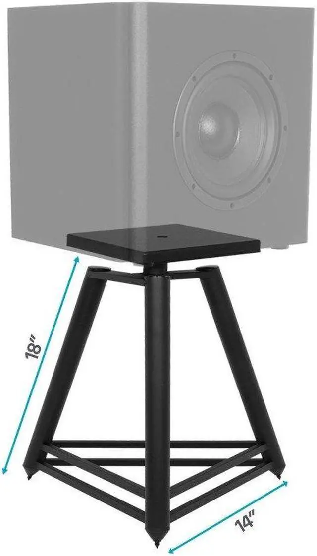 The Monolith Easel Style Speaker Stand is made from a robust steel tube material and solid MDF wood. It measures 18 tall and 14 wide and is acoustically inert.