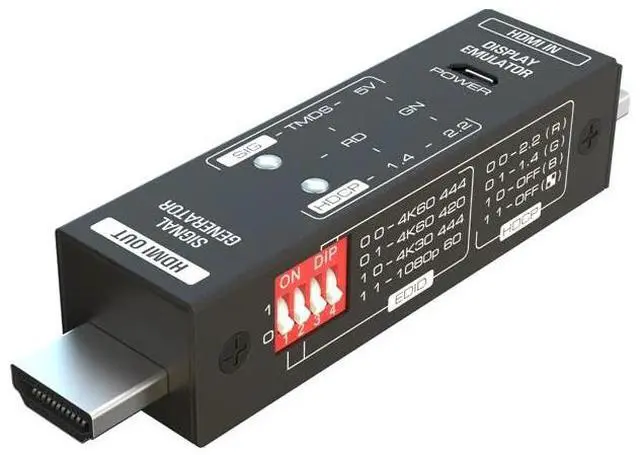 Versatile Installation Tool for AV Professionals The HDMI Signal Generator and Display Analyzer is a highly versatile tool designed for AV installers and testers, streamlining a wide range of signal generation and analysis tasks within a single compact device. Functioning both as an HDMI signal generator and a display emulator (signal analyzer), this innovative unit supports resolutions up to 4K@60Hz in rich 4:4: 4 chroma, ensuring full compatibility with the latest display technologies. A convenient 4pin DIP switch allows users to easily set video resolutions and manage HDCP content, with selectable signal outputs including 4K@60Hz 4:4: 4, 4K@60Hz