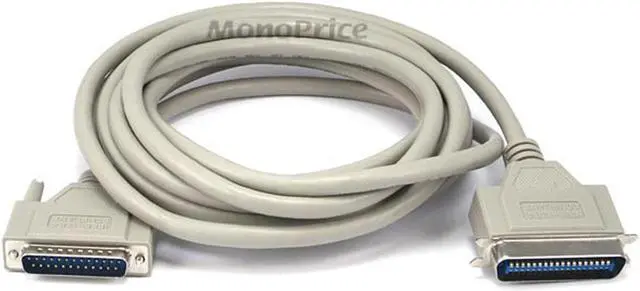 Before the advent of printers with USB connections, the dominant standard was IEEE 1284, aka the "parallel printer interface". If you have a computer and printer with this interface, you can depend on Monoprice to stock the cables you will need to connect them! This parallel printer cable provides the most common printer connection with a DB25 male connector on one end, to connect to the computer's parallel port, and a Centronics CN36 male connector on the other end, to connect to the printer's parallel port. The 18 conductors in this cable consist of 18 tightly woven pairs of wires, with one conductor in each providing the signal and the second providing a dedicated ground return (except for the 18th pair, which is used for device detection). The connector heads are molded onto the cable and the DB25 end has thumbscrews for securing the connector to the computer, while the CN36 end has metal clip receptacles for securing it to the printer.