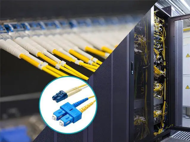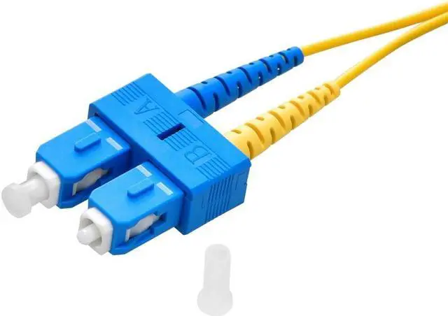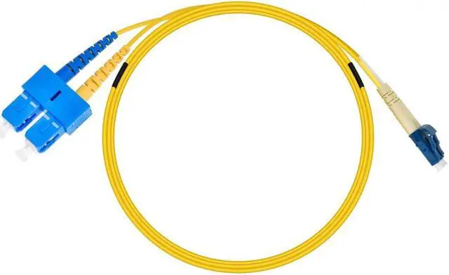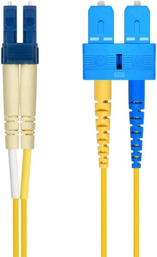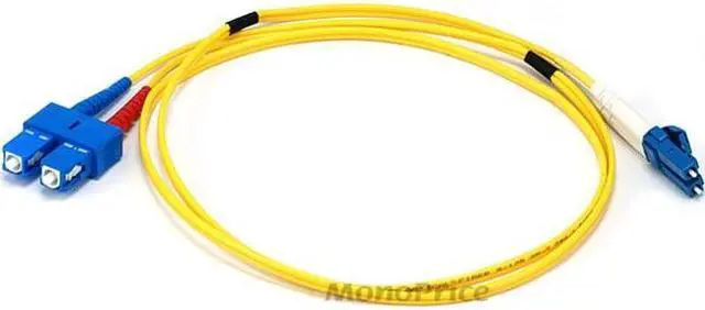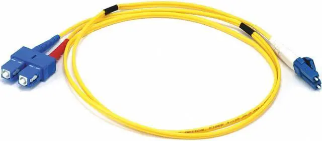 Because of its immunity to electronic interference and its greater speeds over longer distances, fiber optic cabling has become the conduit of choice for high speed network communications. Monoprice is proud to offer a full line of high-quality single-mode and multi-mode duplex cables using optical fibers made by Corning. This is a yellow single-mode cable with a 9m core and 125m cladding diameter. The cable has a color-coded dual LC connector on one end and a dual SC connector on the other end. The cable jacket is OFNR (Optical Fiber, Non-conductive, Riser) rated by UL, which means that it complies with fire safety and insurance requirements and is safe for use within the walls, and between the floors, of commercial class buildings.