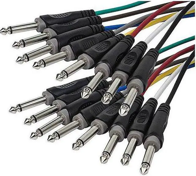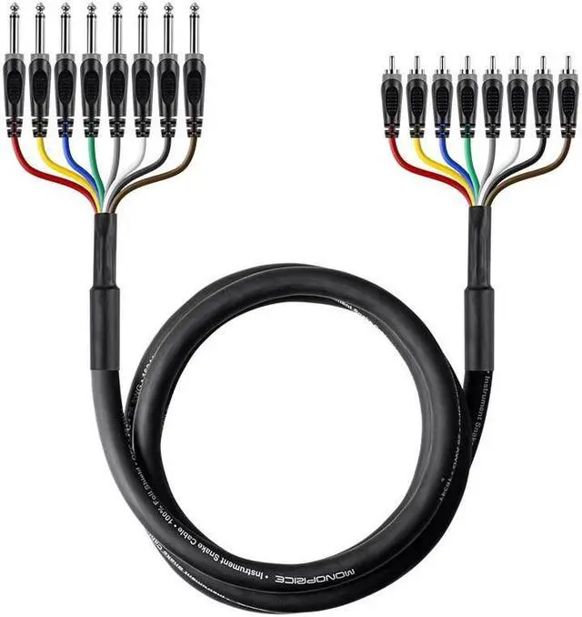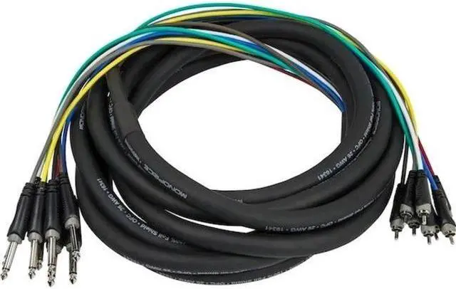 Connect up to eight channels of audio between equipment with 1/4-inch TRS jacks and devices with XLR jacks using this 8-Channel 1/4-inch TRS Male to XLR Male Snake Cable from Monoprice! This snake cable features eight balanced mono or unbalanced stereo lines with color coded wires (red, white, green, yellow, black, blue, gray, and brown). Each wire is constructed of a pair of 26 AWG conductors with aluminum foil shielding to protect from stray EM and RF interference. The wires at one end are terminated in 1/4-inch TS plugs, while at the other end they are terminated in RCA plugs.