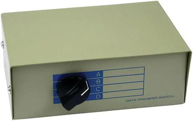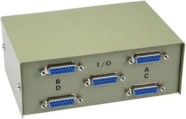 Convenient, 4 x 1, DB15, Bidirectional Switch Box. Select between up to four sources or destinations. Rugged Steel Construction. DB15 female ports. Simple installation and use. Bidirectional. Rotary Dial. Beige Color.