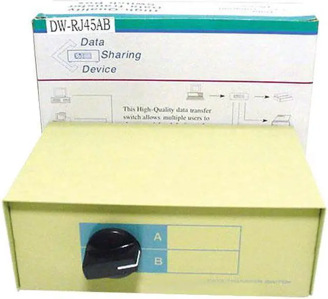 Convenient 2 way RJ45 (Ethernet Type) switch box. Rugged Steel Construction. RJ45 (Ethernet type) female jacks. Simple installation and use. Bidirectional. Rotary Dial. Beige Color.