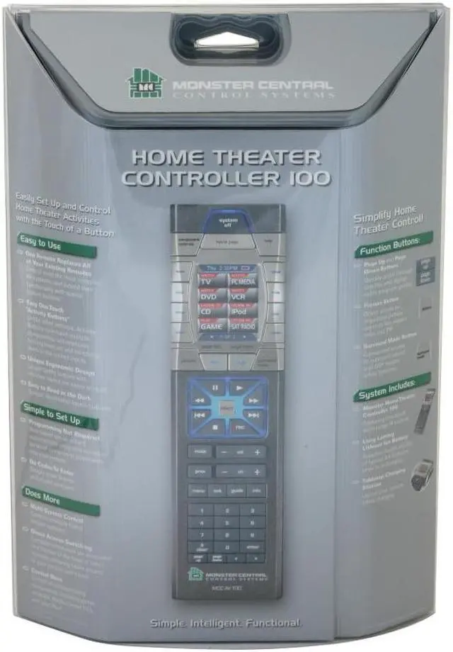 One Remote for All Your AV ComponentsWith fully-customizable Activity Buttons and built-in memory, the Monster Home Theater Controller 100 provides an all-in-one solution for one-touch control over all your AV gears including the TV, satellite radio, Media Center PC, VCR, projector, DVD, amplifier, iPod and more.