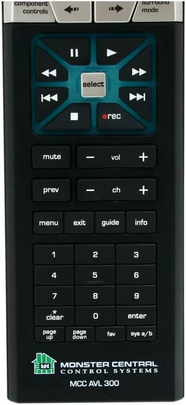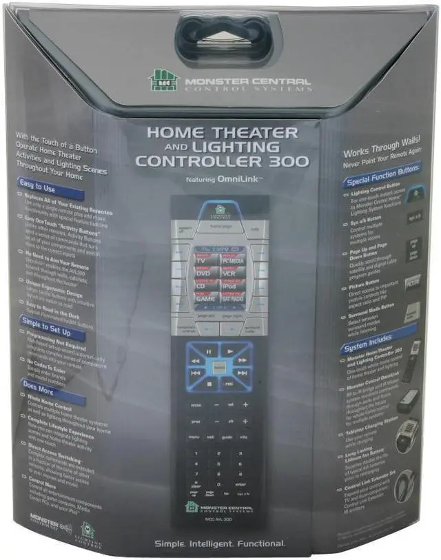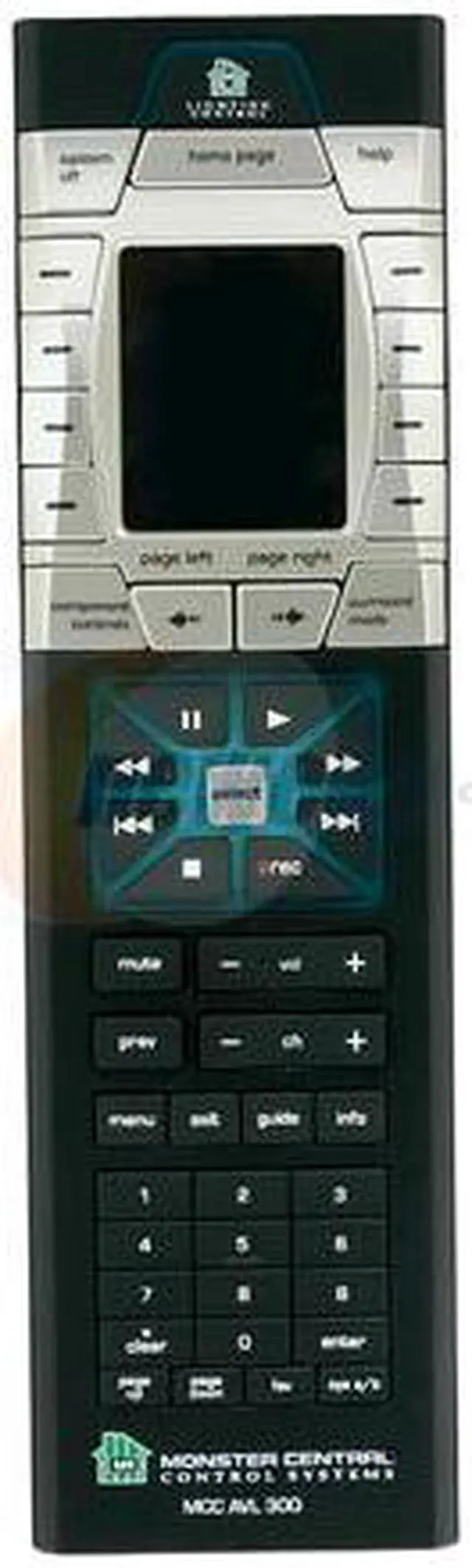 | Features | Built-in “Whole-Home” control of Monster Central Lighting System dimmers and switches. System includes MCC AVL300 Controller, OmniLink and Wireless PC Link for extended remote range and PC connection. Media, glow and two user-programmable buttons for added control features. Simple online, question-based setup of AV Components through Monster Central website. Includes Charging Cradle with rechargeable lithium-ion battery. Controls multiple zones from anywhere in the home without need of custom integrated wiring and control panels. Extended control of AV components through floors, walls, ceiling, and furniture with MCC OmniLink Easy online-based Monster Central Lighting configurations for customized scenes, timer events, and advanced lighting controls. Easy to Use: Replaces All of Your Existing Remotes. Use only a single remote to command multiple components at the same time, plus add more functionality with special feature buttons. Unique Ergonomic Design. Larger tactile buttons with intuitive layout are easier to read. Easy to Read in the Dark. Color LCD screen and backlit buttons provide clear, friendly interface. Easy One Touch “Activity Buttons”. Unlike other remotes, Activity Buttons send a series of commands that turn on all of your components and switch them to the correct inputs. No Need to Aim Your Remote, Omnilink enables the AVL300 to work through walls, cabinets, and throughout the house.* Home Theater and Lighting Control Made Easy: Better Than Other Remotes Unlike other remotes, our component and lifestyle Activity Buttons send multiple commands to multiple devices automatically, allowing true one-touch control. No Complex Programming Required. Easily configure home theater activities and lighting scenes to create lifestyle activities via your computer and the online set-up wizard. |